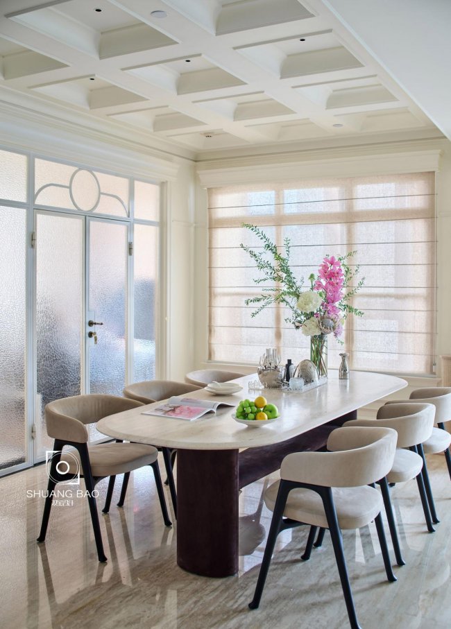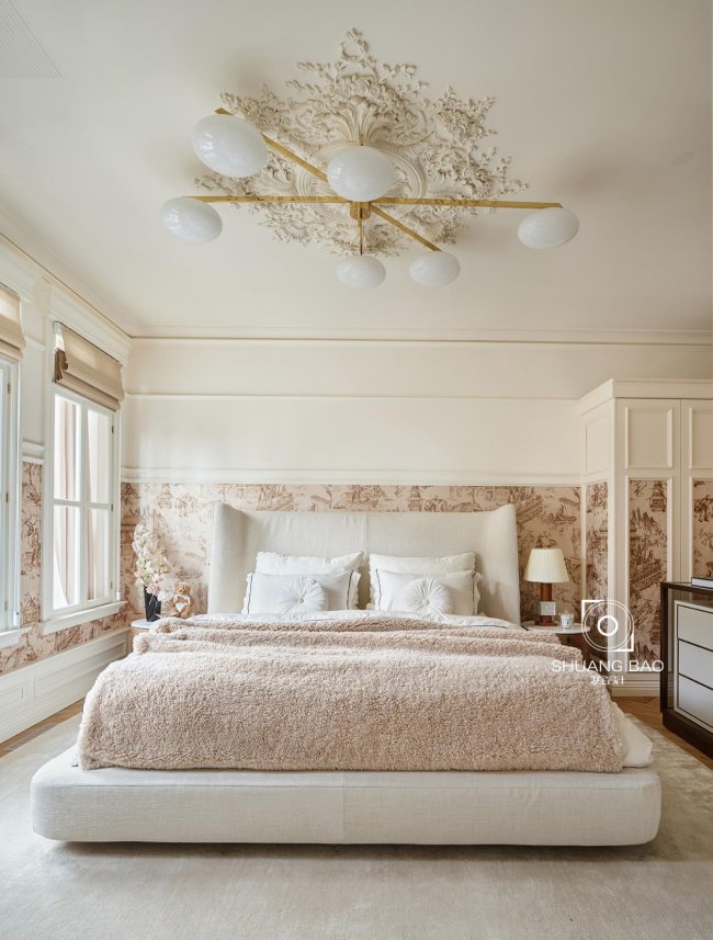 设计师依据屋主的喜好,强化空间的文化格调与情怀,将对生活美学的思考藏于收纳之中。天花板上饱满立体的法式雕花,绚烂又精致,勾勒出浓郁的浪漫主义气息。