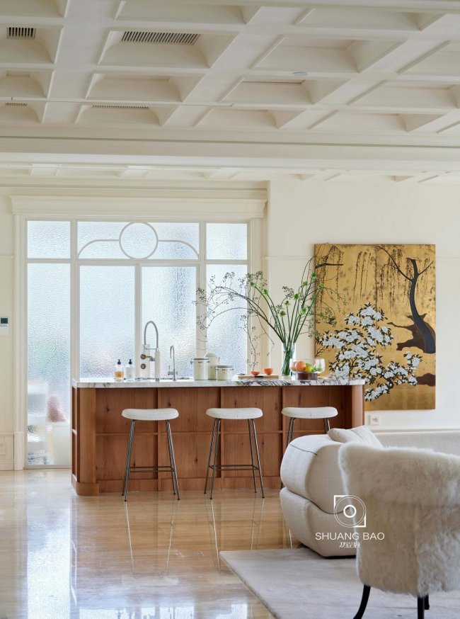 公共区域选用天然洞石通铺地面,足以抵御日常宠物的磨损,也方便日常清理,维护健康和整洁的居住环境。墙上的樱梅柳图画呈现出静态和谐的空静景致,自然之韵与生活之诗于家中交织错落。