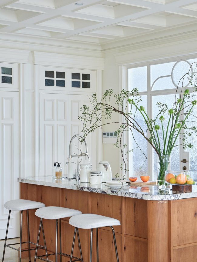 SMEG水壶的奶油色烤漆外观为备餐区增添优雅的法式格调,将此处的时尚氛围立体呈现,巧妙地点缀出屋主不凡的家居品味。备餐区与餐桌相邻而作,GUBI的吧台凳与Baxter餐椅遥相呼应,提升空间的简约精致性。