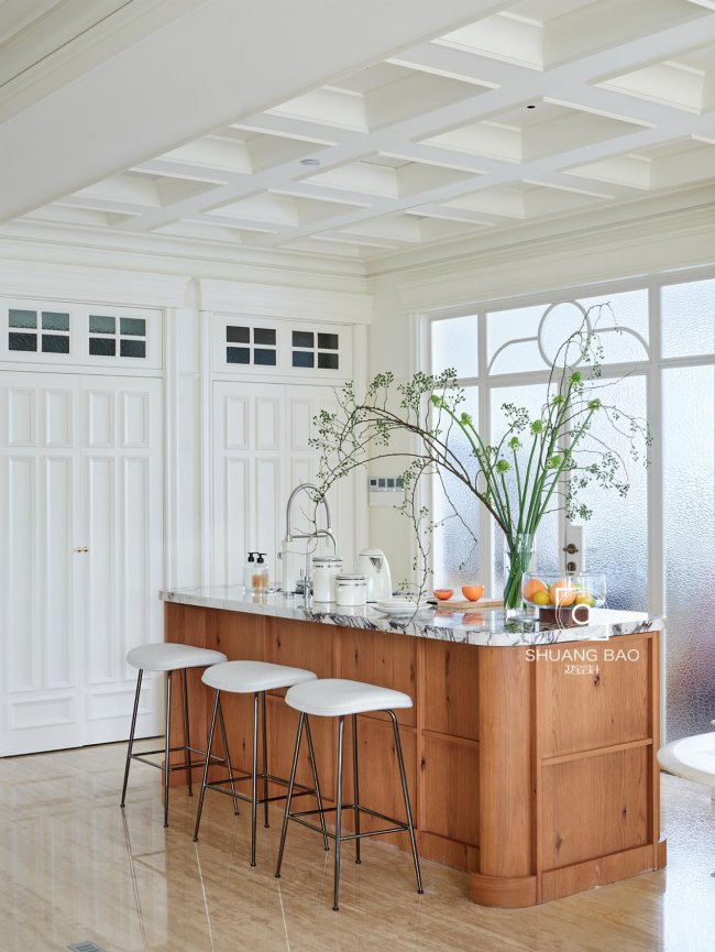 为了更好的融入家的整体氛围,吧台选用优质木材与宝格丽台面相结合,温润的木质增添几抹时光的厚重与静美。大理石台面平添了几分自然气息,并且方便屋主的日常备餐与清洗蔬果,无惧猫咪的上下跑酷,转角的曲面设计规避了直角带来的生硬感。