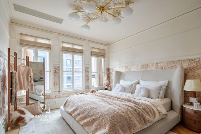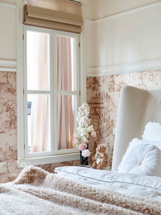 原始房屋以幕墙玻璃为主,同时拥有50cm宽的窗台不可拆卸。设计师为了处理此处结构的弊端,在窗台处新增经典的法式格子窗,增强整屋浓郁的氛围感。并将空间巧妙运用起来,两窗之间的间隙可以作为猫咪亲密接触阳光的场所,悠闲又惬意。
