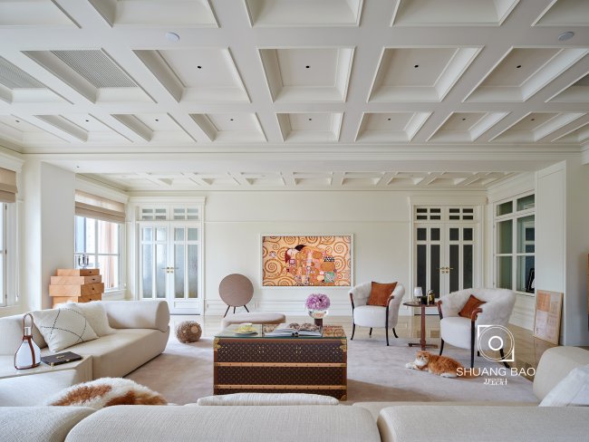 古铜金把手与金纹镶边,彰显屋主复古雅致的艺术品味。珍珠白的墙面整洁利落,墙上Vintage挂画稳重气韵,两架温润复古的单椅静置于挂画之下,再次为过厅增添了一丝中古硬朗的艺术气息。在此处设计师以四扇法式双开门的巧妙布局,周密防止宠物进入屋主私人空间造成混乱或出逃户外的隐患。