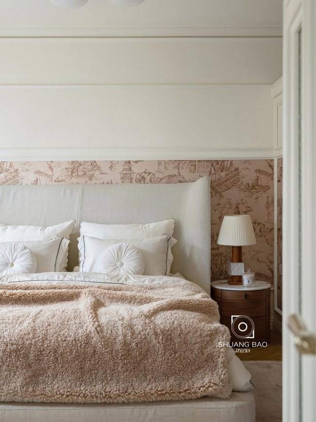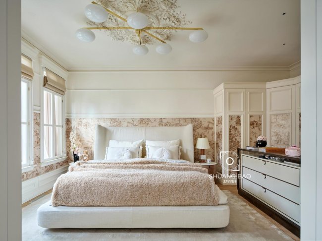 Pierre Frey的金丝壁纸是卧室的视觉焦点,简约的室内陈设与东南亚湖畔风情相互碰撞而彼此交融,调动屋内的整体氛围,半墙壁纸设计赋予空间不同情绪,让优雅层层递进。
