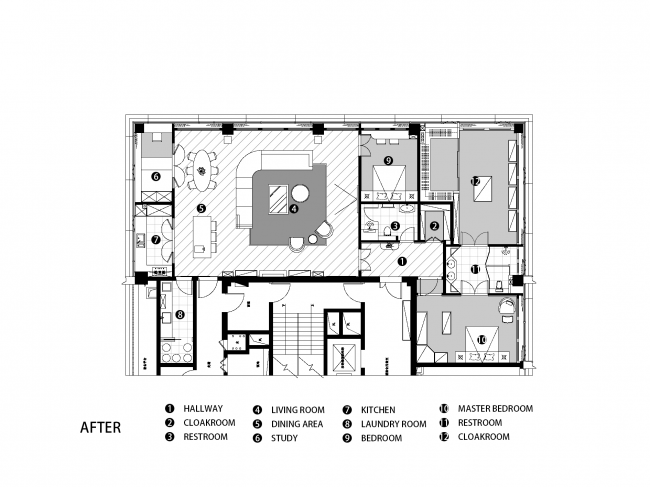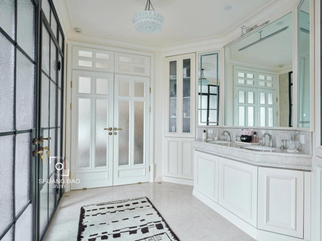 卫生间标准的三分离设计,展示出独立与干练的气质,双人洗漱台与三面镜,大大提高空间的使用率。ZAMANI地毯简约的图案赏心悦目,与Vintage吊灯上下呼应,于井然有序的过道空间增添生活的松弛感。