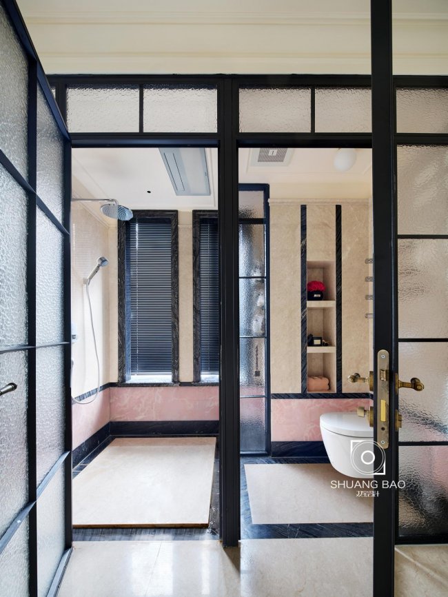 黑米系回型铺贴地面与纯天然粉色玉石共同营造出与其他空间明暗有别的节奏变化,让人不自觉地在这既定的节奏中沉淀、放松。在高压忙碌的生活中享受沐浴带来的放松时刻,实现由身心至灵魂的极致放松。
