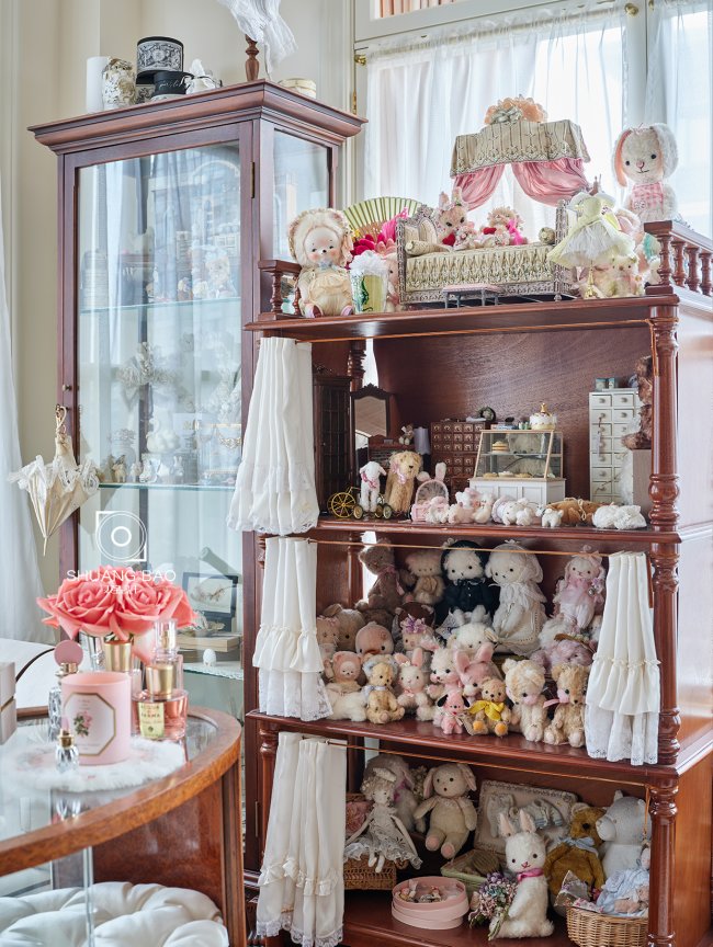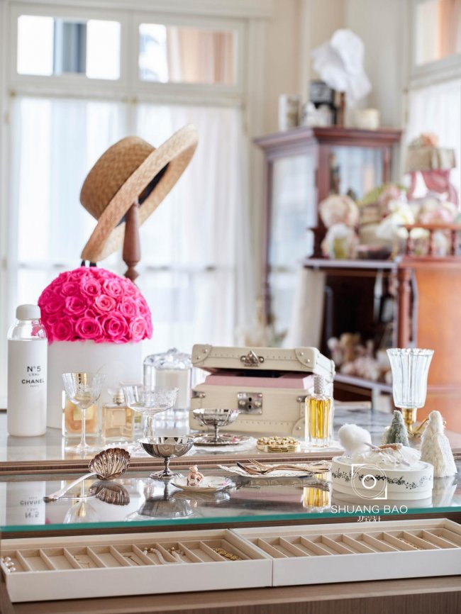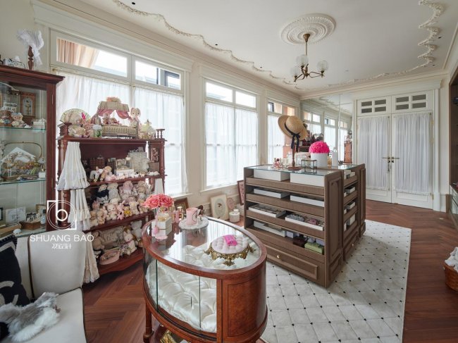 室内姿态各异的玩偶都是女主人的宝贝,华美闪耀而不浮夸。环视整个衣帽间,它承载着非常多的女主人的情感,室内的每一件物什都是丰富而立体的存在。