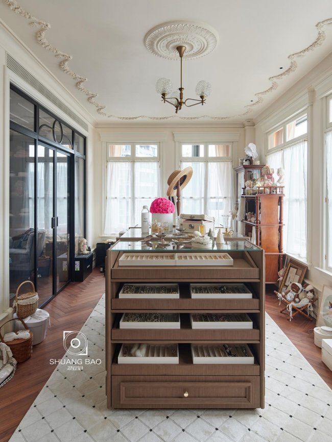 中岛柜将女主人喜爱的首饰器具尽数收纳,首饰陈列一目了然,银质器具散发着低调奢华的质感,于细微处彰显出女主人优雅浪漫的审美品味。