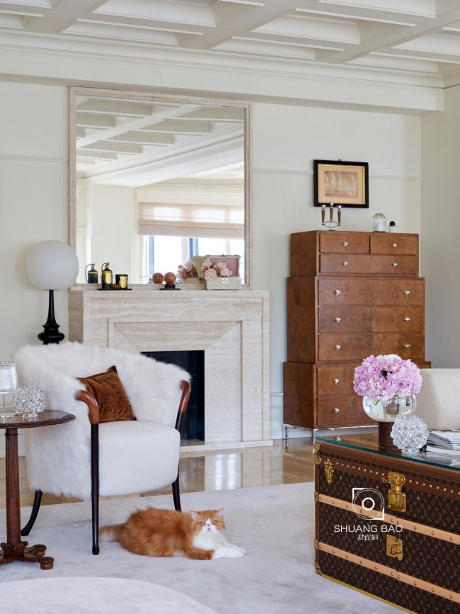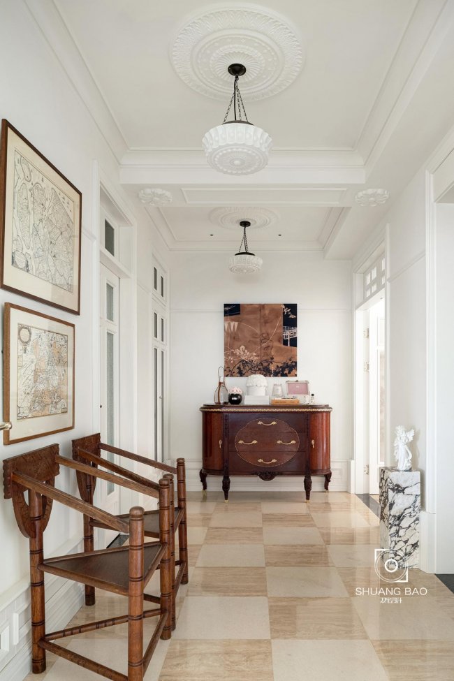 推开居所大门,过厅处摆放着屋主在外淘来的路易十六风格的樱木五斗柜,为迎接主人的回归做好收纳准备。