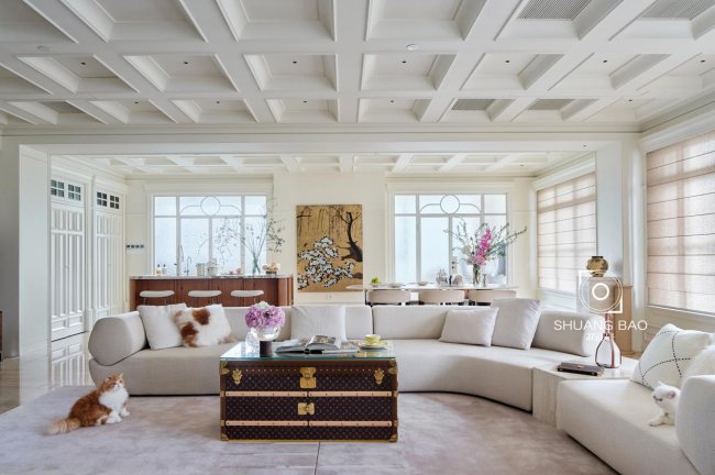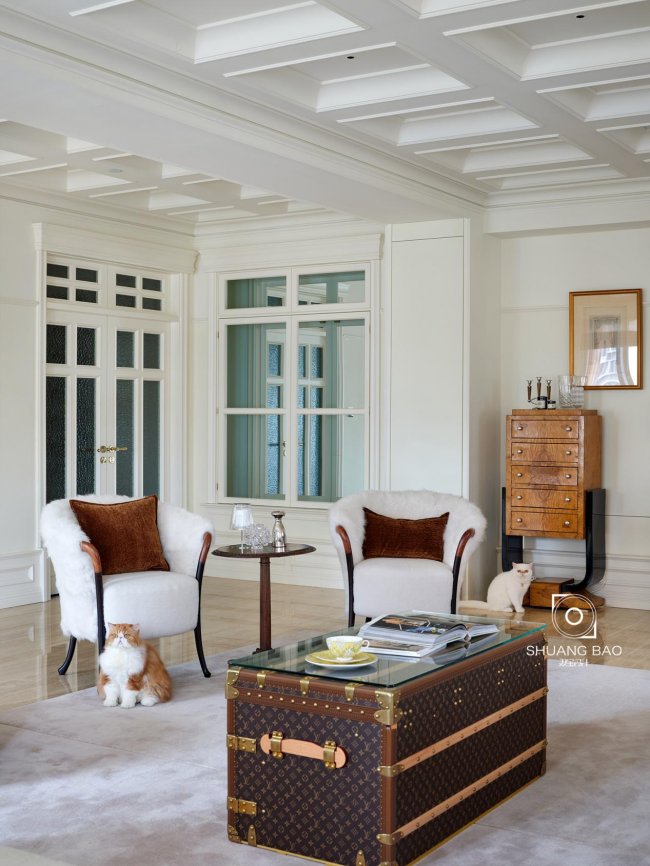居于客厅中央的茶几是屋主喜爱的Louis Vuitton硬箱系列,经典的monogram老花图案与利落的几何线条散发着沉稳庄严的气息,彰显着经久不衰的岁月馥郁之美。
