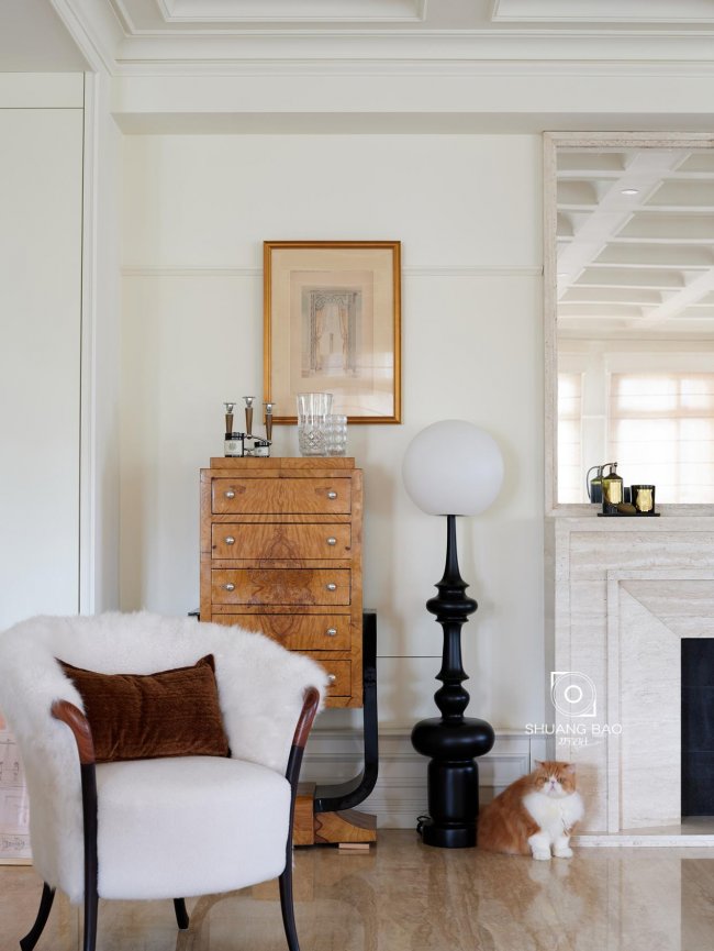 壁炉右侧的Vintage抽屉柜造型简约,色泽温润,上方的Vintage挂画,也是屋主精心淘到的珍藏品,承载着业主记忆的故事。屋内摆放着的众多中古物件,都是屋主的“心头好”,经过岁月的洗礼,其不可复制的稀缺性与独特性,都是对历史的庄严回溯,寄托着屋主的情怀与人生态度。
